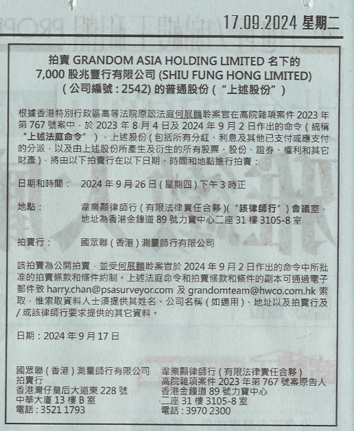 根據香港高等法庭命令,我司將於2024年9月26日拍賣Grandom Asia Holding Limited名下7000 股兆豐行有限公司的普通股份。